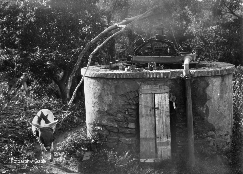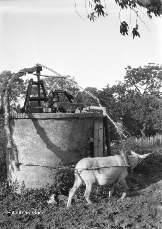 1932. Afrikareise. Ein Esel treibt ein Schöpfwerk an. Brunnen
