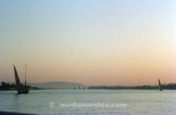 1966. Afrika. Egypt. Ägypten. Luxor. Segelboote auf dem Nil. Abendstimmung.