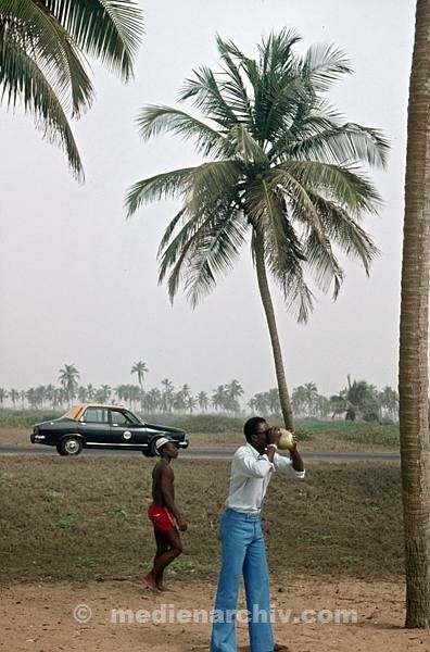 1975. Südafrika. Mann öffnet Kokosnuss mit einer Machete