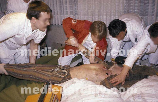 1990. Notarzteinsatz. Häusliche Reanimation. Patient liegt im Bett, sofortige Intubation, externe Herzmassage und Beatmung über Ambubeutel