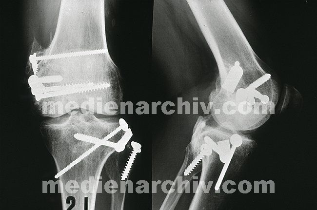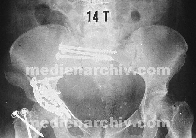 März 1989. Krankenhaus. Chirurgie. Arzt. Röntgenaufnahme nach Beckenstabilisierung.