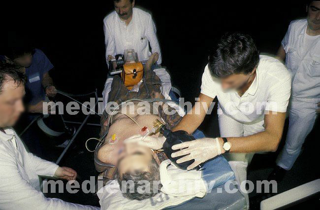 1990. Essen. Krankenhaus. Arzt. Ankunft eines Schwerverletzten mit dem Helikopter und Versorgung. Transport vom Hubschrauber zum Schockraum