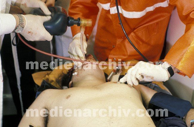 1990. Essen. Notarztwagen. Einsatz nach Verkehrsunfall auf der Autobahn mit zwei verunfallten Motorradfahrern. Auskultation zunächst der linken Lunge unter Korrektur des Tubus.