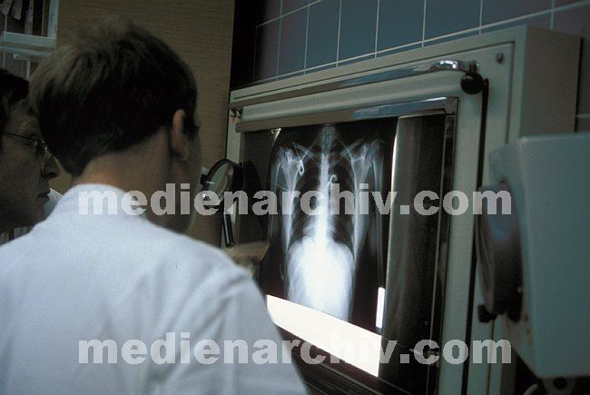 1989. Essen. Notarzt. Krankenhaus. Versorgung eines Patienten nach einem Verkehrsunfall. Begutachtung der Röntgenaufnahmen.