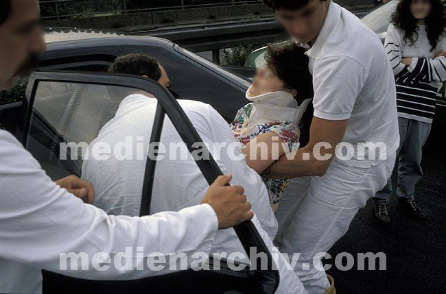 1990. Notarzteinsatz. Verkehrsunfall auf der Autobahn. Auffahrunfall mit mehreren Verletzungen. Patientin mit Schmerzen im Bereich der Halswirbelsäule wird nach Anlegen eines Stifneck im Rautengriff aus dem PKW befreit.