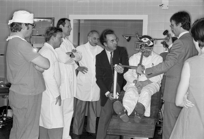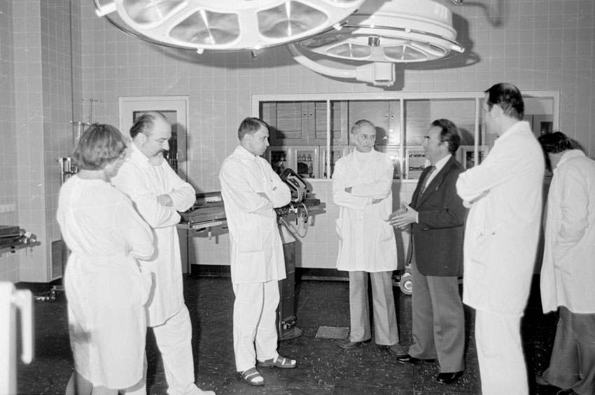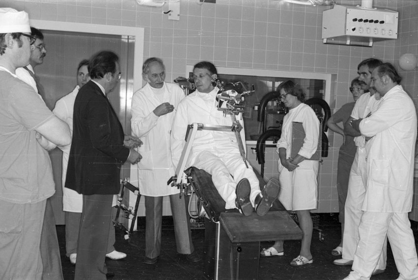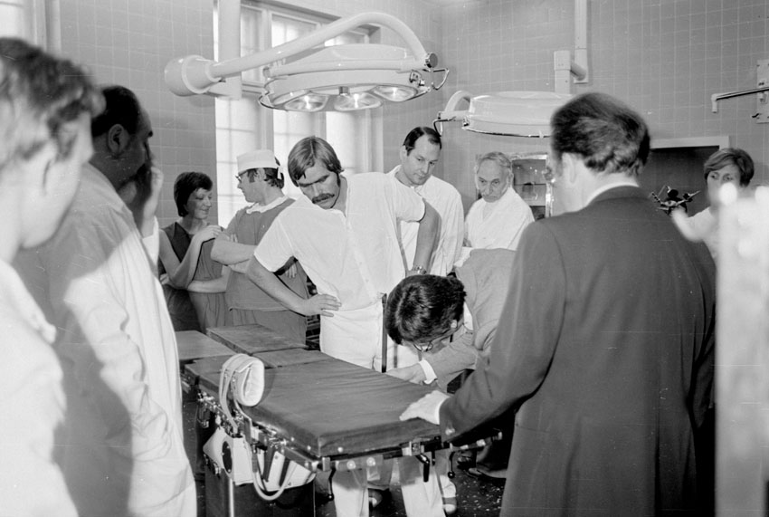 12. 11. 1979. Klinikum Berlin-Buch. Neurochirurgie. Vorführung eines neuen Operationstisches. Hinten: Dr. Friedrich Weickmann