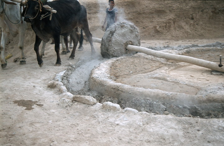 1983. Südasien. Indien. indischer Subkontinent. Republic of India, Republik Indien, Bharat Ganarajya. Ein Ochsengespann an einer Art Mühle zum Zerkleinern von Steinen.