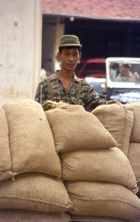 1974. Asien. Taiwan. Soldat hinter Sandsäcken