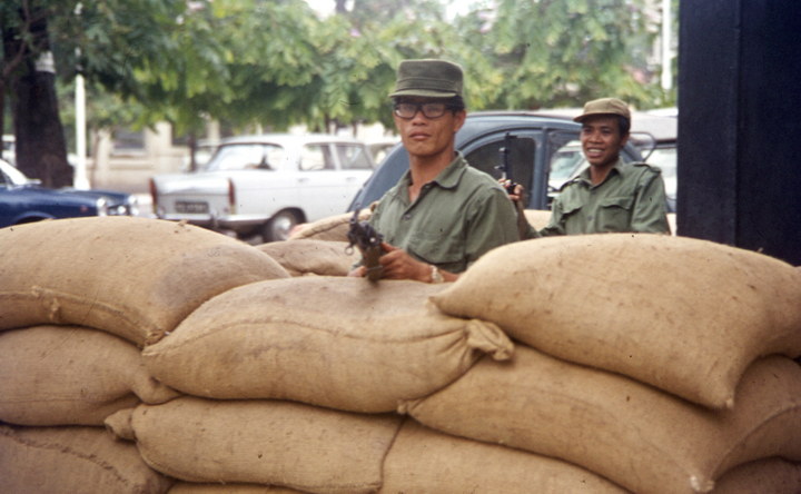 1974. Asien. Taiwan. Soldaten hinter Sandsäcken. Posten