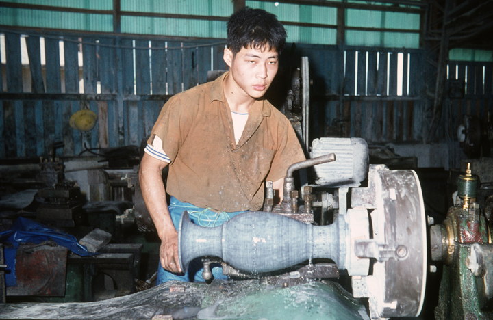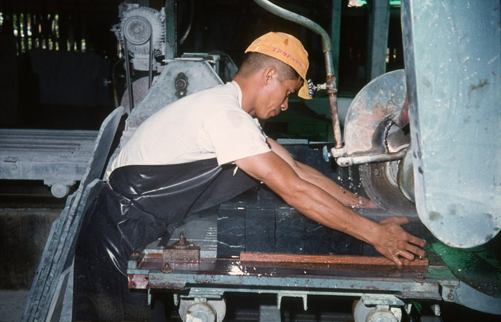 1974. Asien. Taiwan. Arbeiter an einer Steinschneidemaschine. Steinsäge