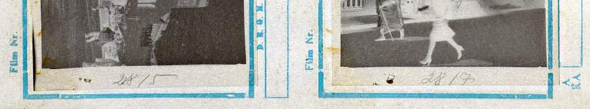 Die Planfilme dieses Konvoluts messen 60 x 88 mm und die darauf belichteten Fotos 58 x 82 mm. Das entspricht dem 6 × 9 Format. Leider stehen Hersteller und weitere Bezeichnungen nicht auf den Filmrändern, um mehr über das konkrete Aufnahmematerial zu erfahren. Es ist nicht besonders feinkörnig, was aber durch die relativ große Filmformat kompensiert wird. Vermutlich wurde ein für damalige Verhältnisse relativ hochempfindlicher Film (max. ISO 100) verwendet. Erkennbar ist das Korn allerdings erst nach dem Scannen auf einem großen Monitor bei der Suche nach lesbaren Infos auf Litfaßsäulen oder Plakaten.Alle Filme waren gleich groß, exakt rechteckig und hatten gerade Ränder. Sie konnten deshalb nicht mit einer Schere aus einem Rollfilm herausgeschnitten worden sein. Bei vielen hafteten noch dünne Papierstreifen an einer schmalen Seite. Darüber hinaus wiesen alle am Rand eine kleine Druckstelle auf von der Klammer zum Aufhängen nach der Entwicklung.