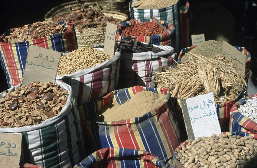 Marokko. Markt. Säcke mit Nüssen, Gewürzen und Kräutern.