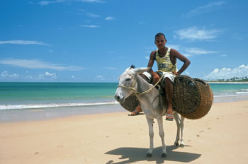 Brasilien. Junger Mann auf einem Esel am Strand