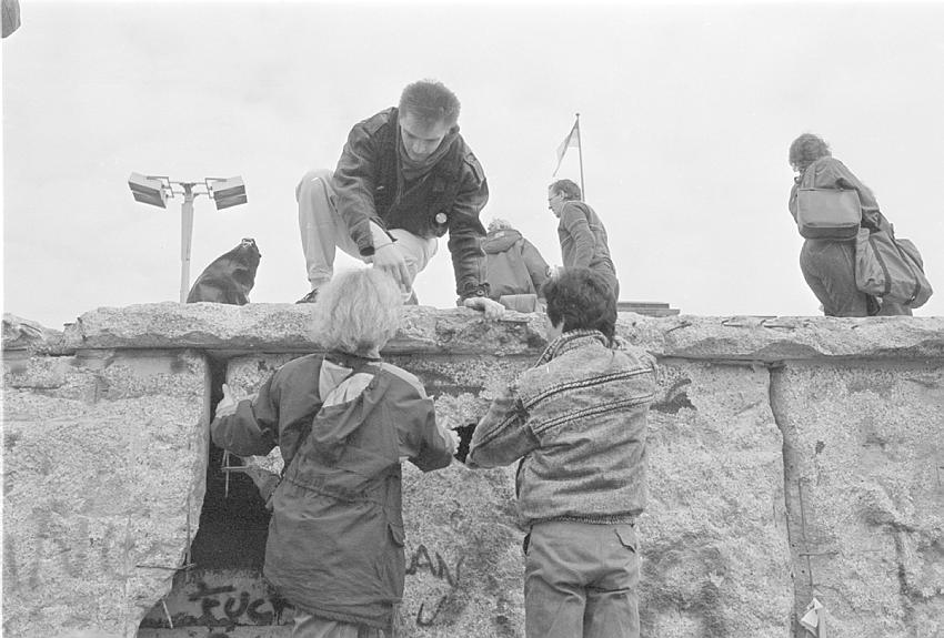 19. 2. 1990. Berlin. DDR Grenze. Menschen auf der Berliner Mauer. Brandenburger Tor. DDR Grenze