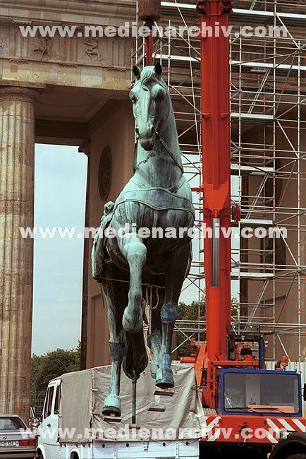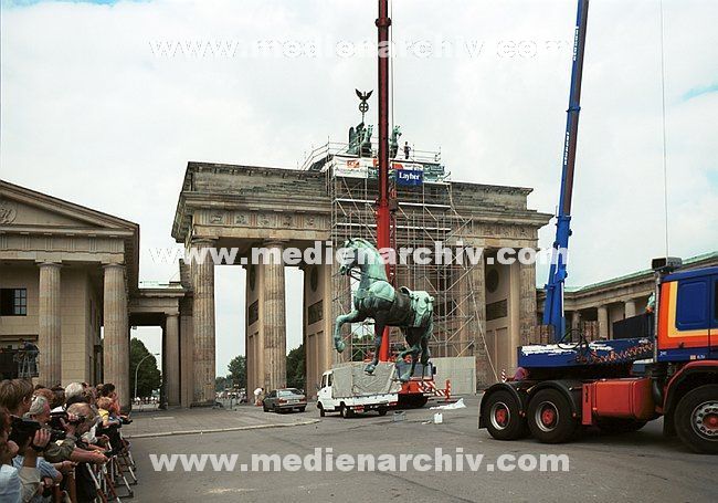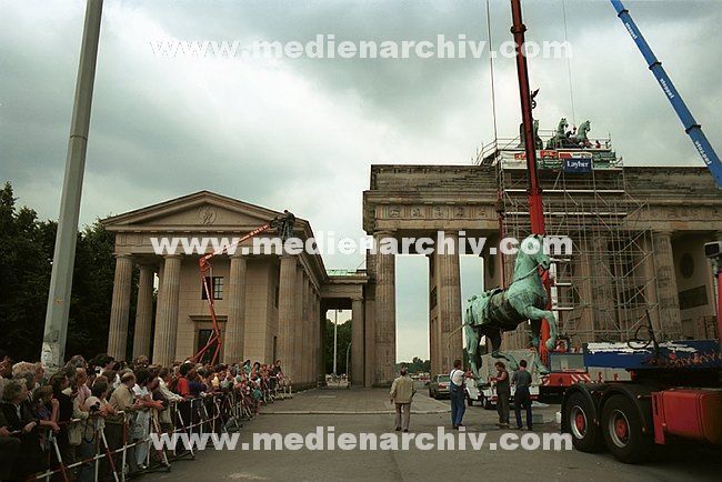 16. Juli 1991. Berlin. Berlin-Mitte.Die restaurierte Quadriga wird auf das Brandenburger Tor montiert .