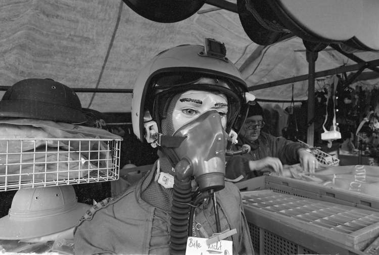 Februar 1995. Berlin. Charlottenburg. Flohmarkt an der Straße des 17. Juni. Helm. Maske und Pilotenuniform