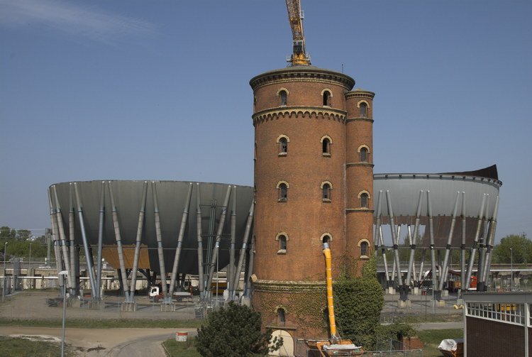 6. 5. 2007. Berlin. Abriss der Kugelgasbehälter des ehemaligen Gaswerks Charlottenburg mit denkmalgeschütztem Wasserturm.