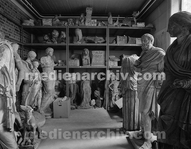 September 1990. Berlin. Charlottenburg. Gipsformerei. Skulpturen / Formen in Regalen. Magazin.