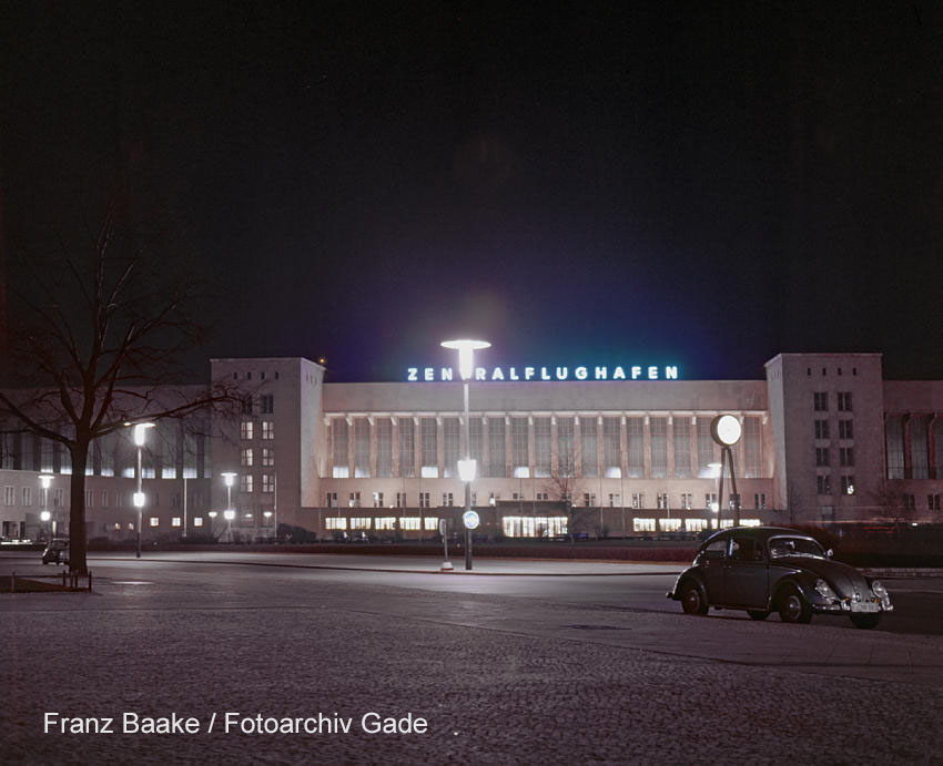 1960. Deutschland. Berlin. Tempelhof. Platz der Luftbrücke bei Nacht. Hungerharke.
