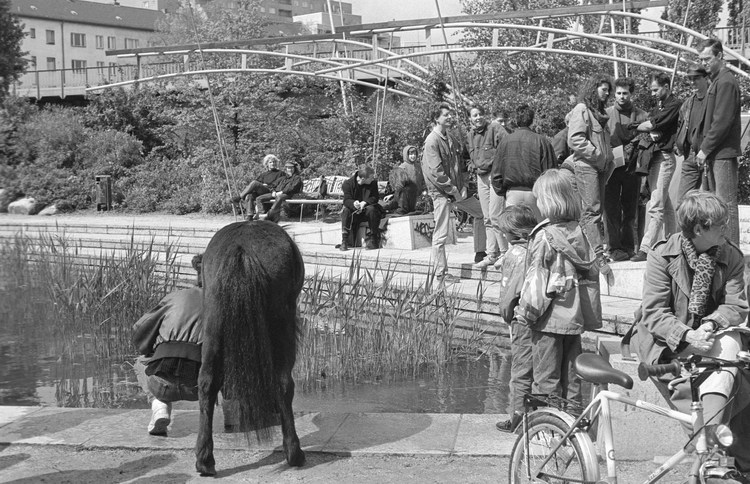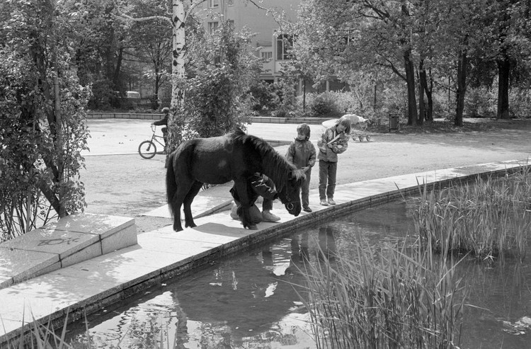 10. 5. 1992. Berlin. Kreuzberg. Wassertorplatz. Künstlicher Teich. Kinder mit Pony