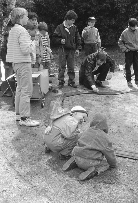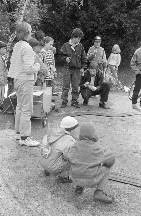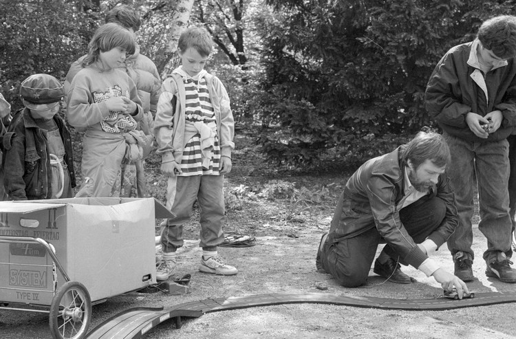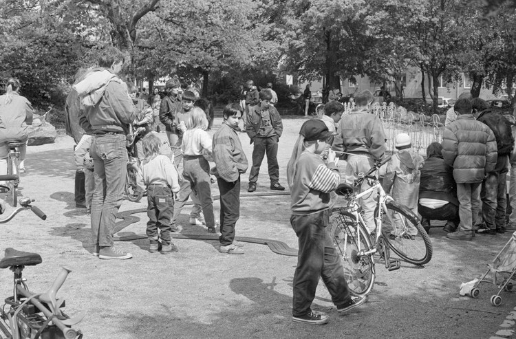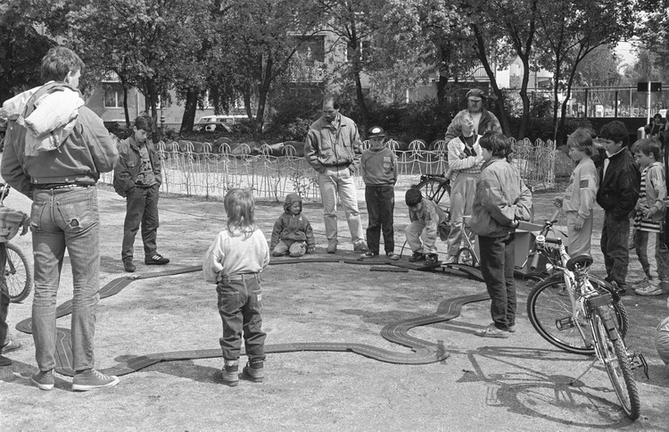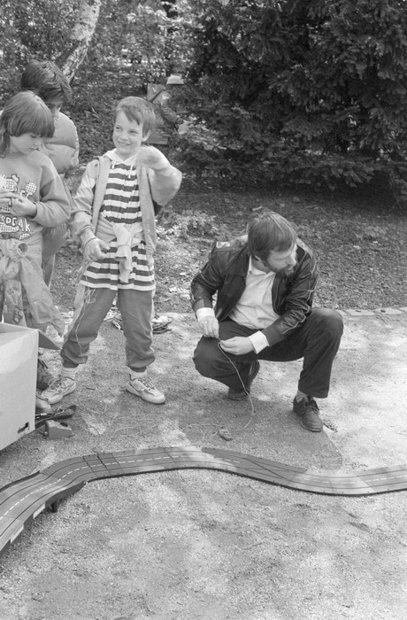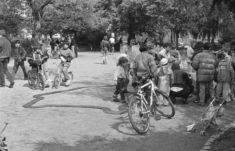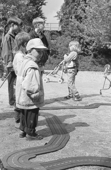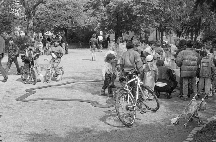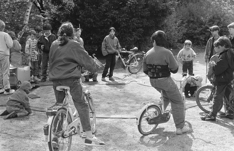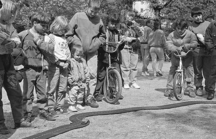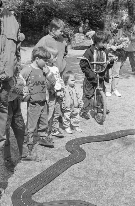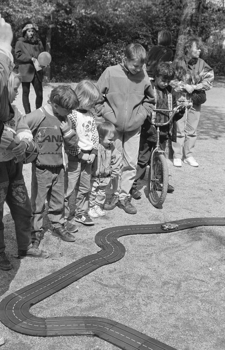 10. 5. 1992. Berlin. Kreuzberg. Fahrraddemo. Radfahrer. Auf dem Wassertorplatz wurde eine Spielzeug-Autorennbahn für Kinder aufgebaut.