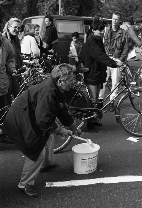 10. 5. 1992. Berlin. Kreuzberg. Fahrraddemo. Radfahrer. Aufmalen eines Fahrradweges auf die Skalitzer Straße