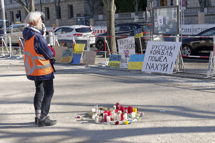 28. 2. 2022. Berlin. Mitte. Str. unter den Linden vor der russischen Botschaft. Proteste gegen die kriegshandlungen in der Ukraine. Mahnwache vor Kerzen