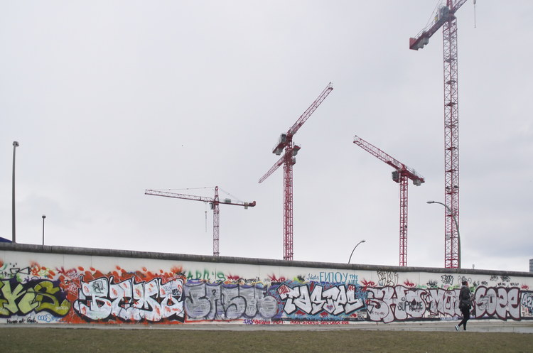 31. 3. 2013. Berlin. Friedrichshain. Rückseite der eigentlichen East-Side-Gallery. Diese Mauerseite wurde auch bemalt. Baukräne