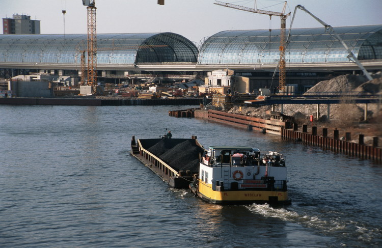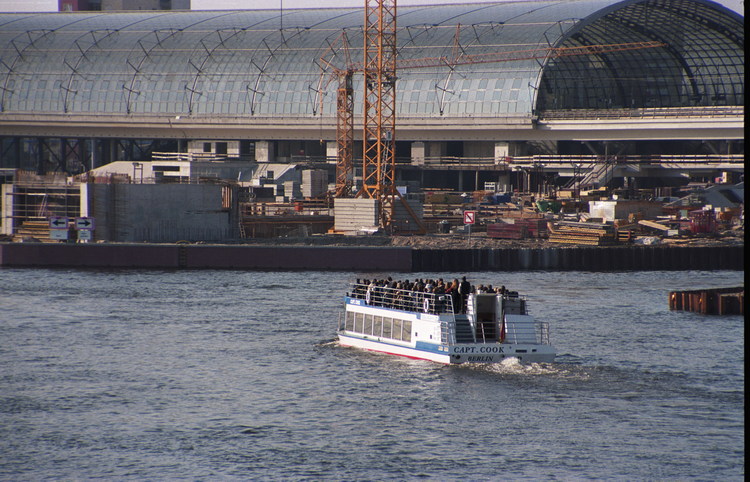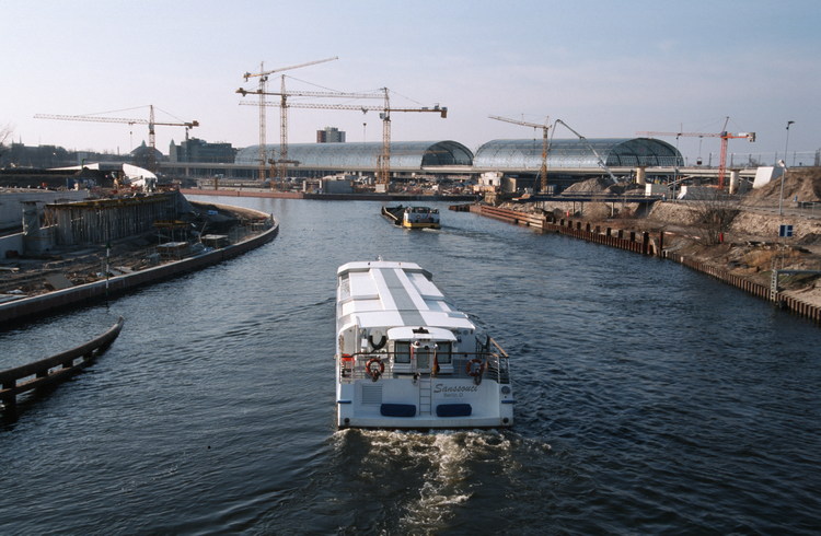 15. 3. 2003. Berlin. Mitte. Moabit. Baustelle Lehrter Bahnhof. Berliner Hauptbahnhof. Ausflugdsdampfer auf dem Fluss Spree