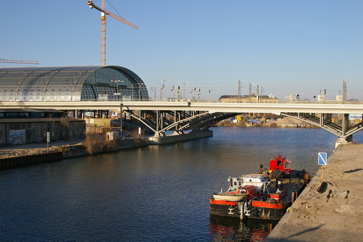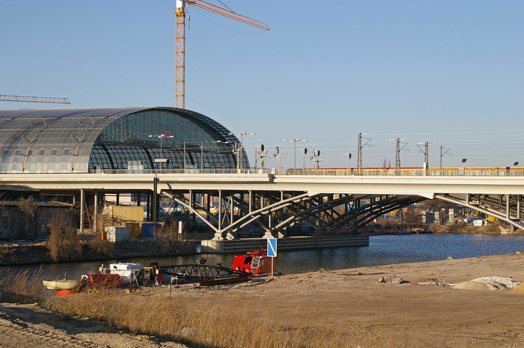 16. 1. 2005. Berlin. Mitte. Moabit. Baustelle Lehrter Bahnhof. Berliner Hauptbahnhof. Eisenbahnbrücke über der Verbindung zwischen dem Fluss Spree und Humboldthafen