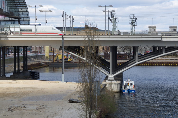 9. 4. 2012. Berlin. Mitte. Moabit. Moabit. Humboldthafen. Boot der Wasserschutzpolizei unter den Bögen der Eisenbahnbrücke des Hauptbahnhofs.