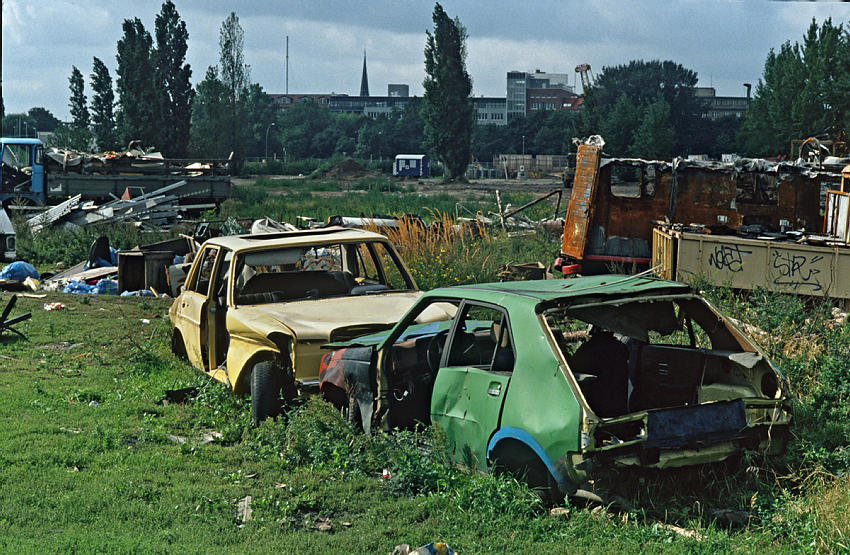 11. September 1994. Berlin. Mitte. Tiergarten. Potsdamer Platz. Schrottautos vor dem Weinhaus Huth