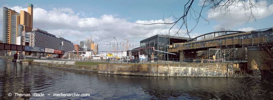 März 1999. Berlin. Mitte. Tiergarten. Baustelle Potsdamer Platz. Landwehrkanal. Links: Debis-Haus