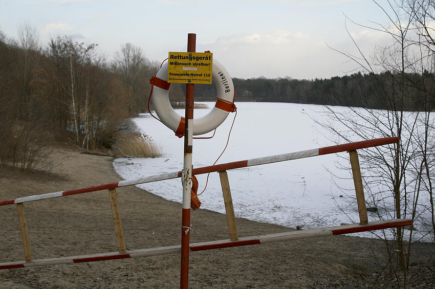 5.3.2006. Berlin. Tegel. Der zugefrorene Flughafensee im Winter. Rettungsmittel. Rettungsring. Leiter