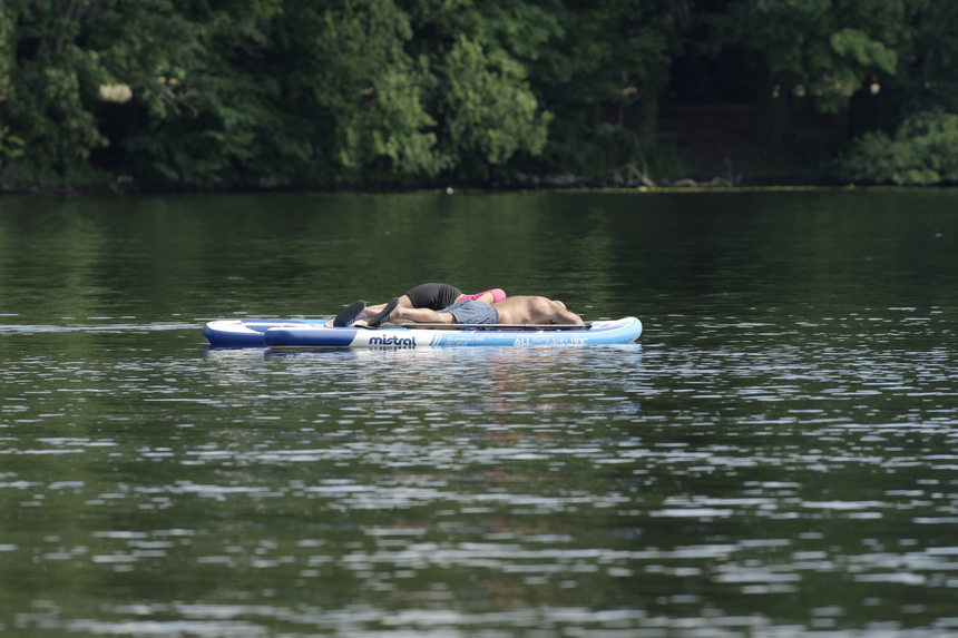 4. 7. 2022. Berlin. Reinickendorf. Tegeler See. SUP. Zwei treibende Stand up Paddleboards mit Leuten, die darauf ausruhen.