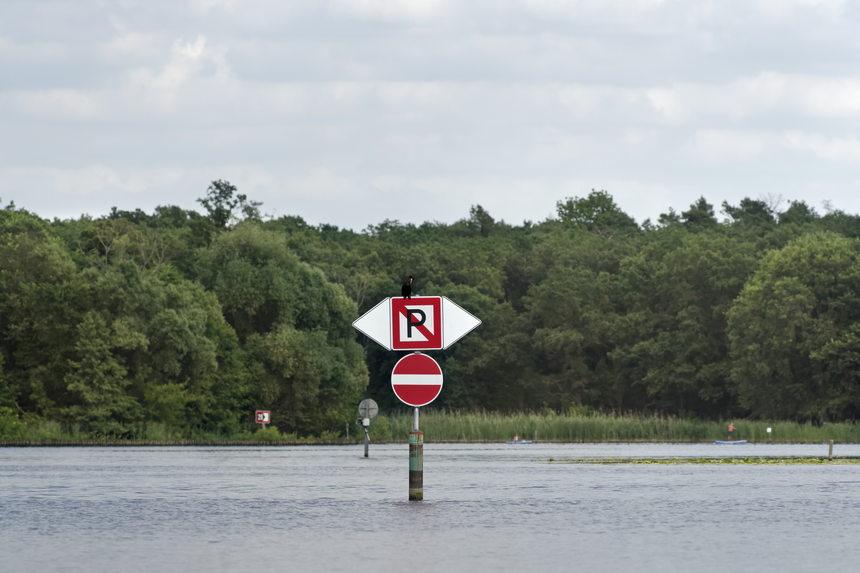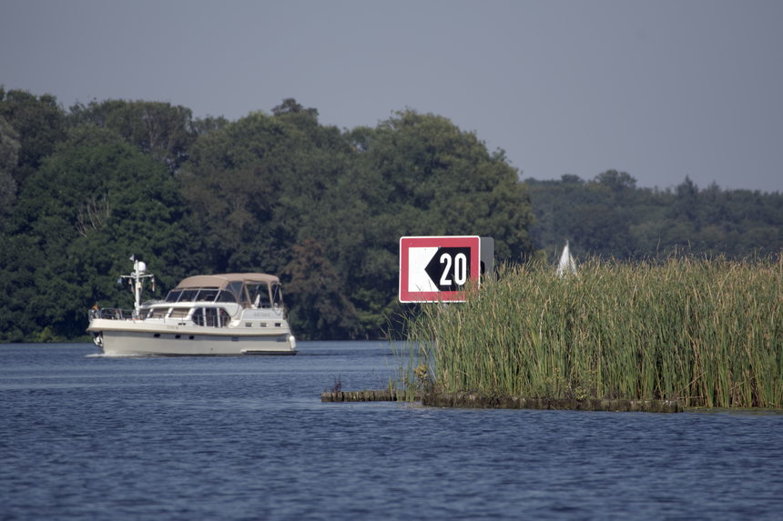 9. 9. 2021. Berlin. Reinickendorf. Tegeler See. Motorboot. Verkehrstafel. Schilfgürtel