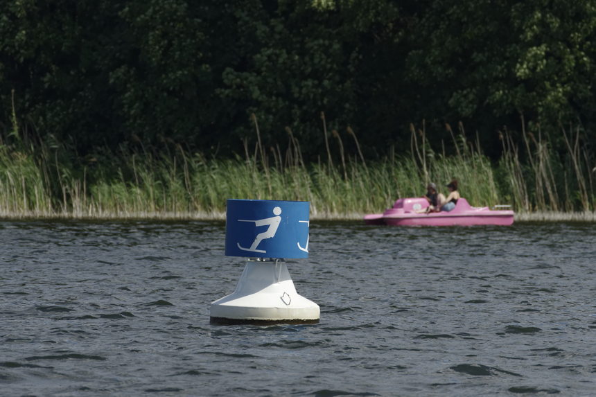 4. 7. 2022. Berlin. Reinickendorf. Tegeler See.Tretboot und Zeichen für Wasserski