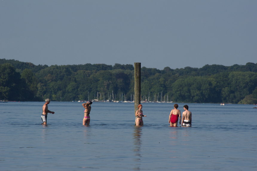 6. 8. 2015. Berlin. Reinickendorf. Tegel. Tegeler See. Menschen beim Baden an einer flachen Stelle neben der Insel Scharfenberg.