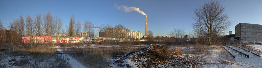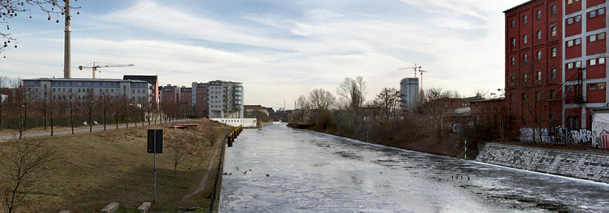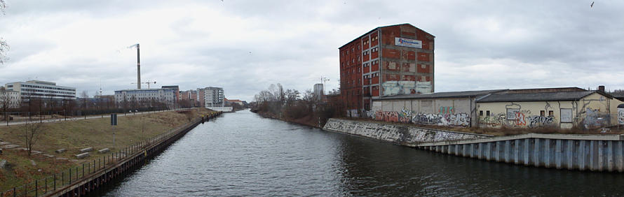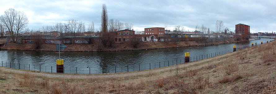 Panorama-Aufnahmen, die aus mehreren Einzelfotos zusammengerechnet wurden. Häufig habe ich vom Kieler Ufer über den Berlin-Spandauer-Schifffahrtskanal das Gebiet auf der anderen Seite fotografiert. Die Panorama-Fotos machen den Eindruck, dass in der Bildmitte eine Biegung im Kanal sei. Das ist aber eine optische Täuschung, die sich aus dem Zusammensetzen von Bildern mit einem 180° Winkel (von links nach rechts) ergibt.