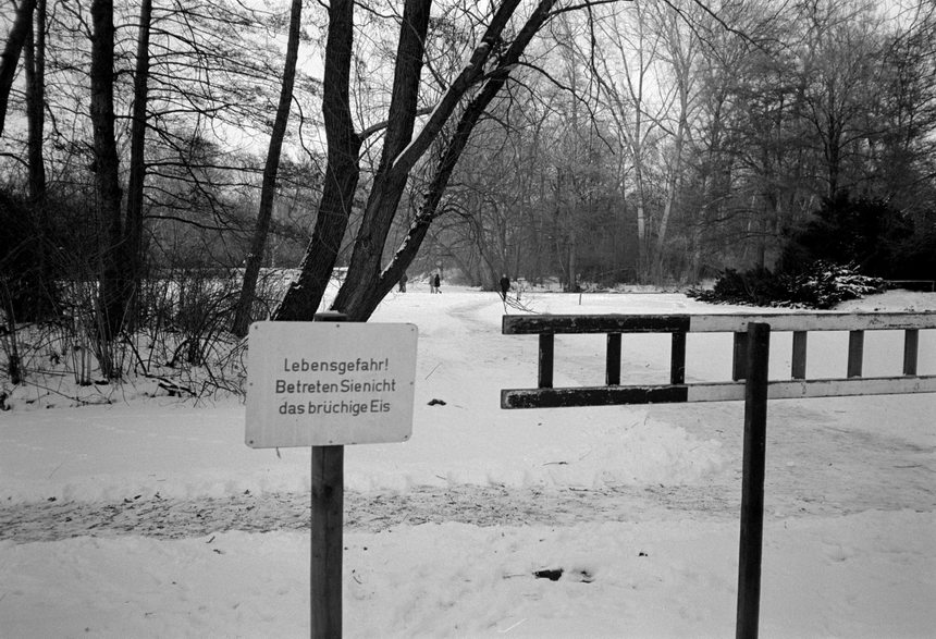 Februar 1996. Berlin. Mitte. Tiergarten. Winter. Schnee. Zugefrorener Neuer See. Leiter. Rettungsring