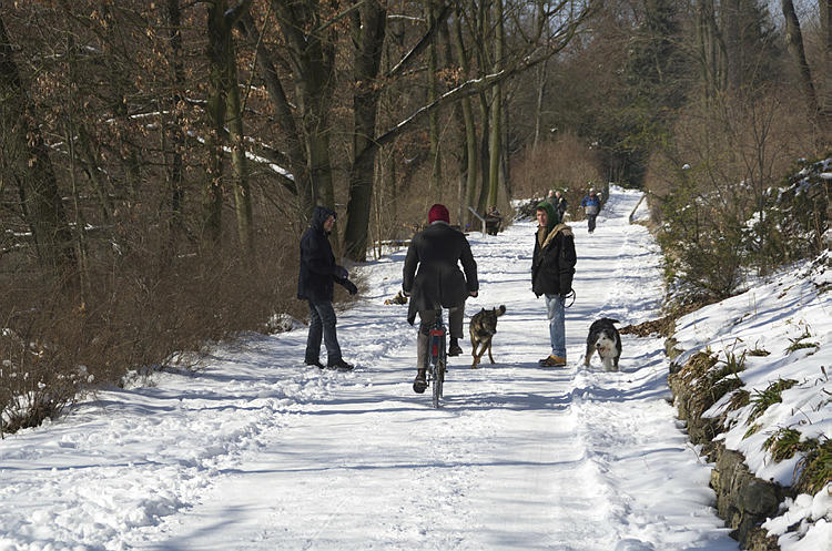 24. 3. 2013. Berlin. Wedding. Winter. Schnee. Verschneiter Weg entlang des Plötzensees. Hunde und Menschen