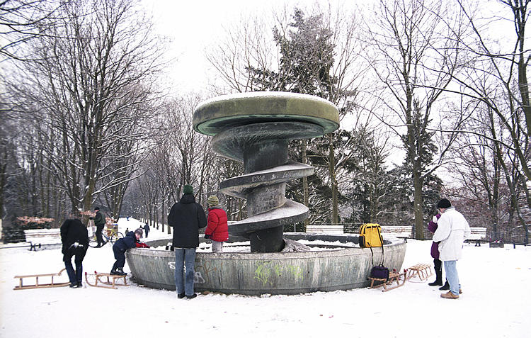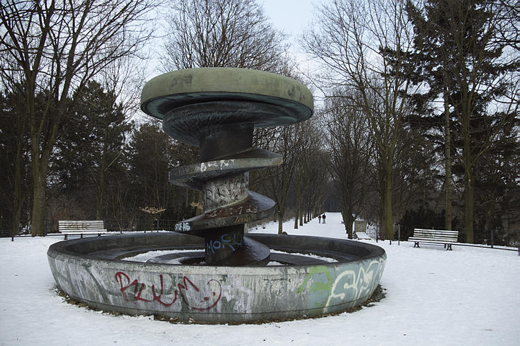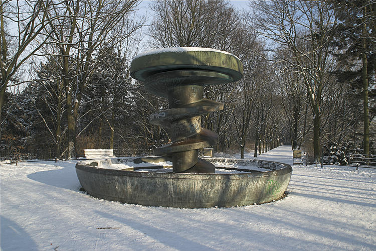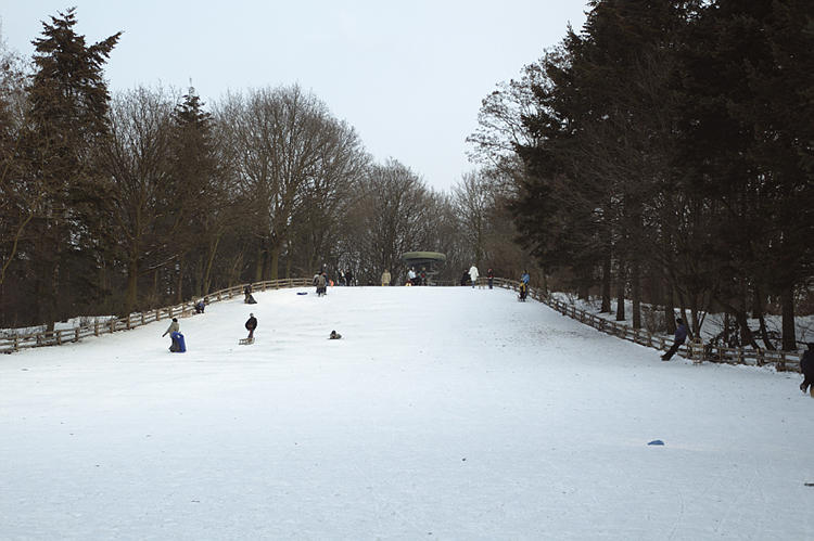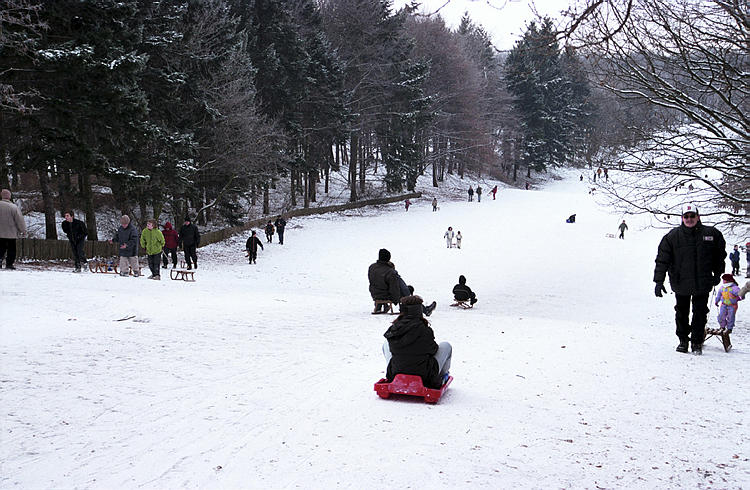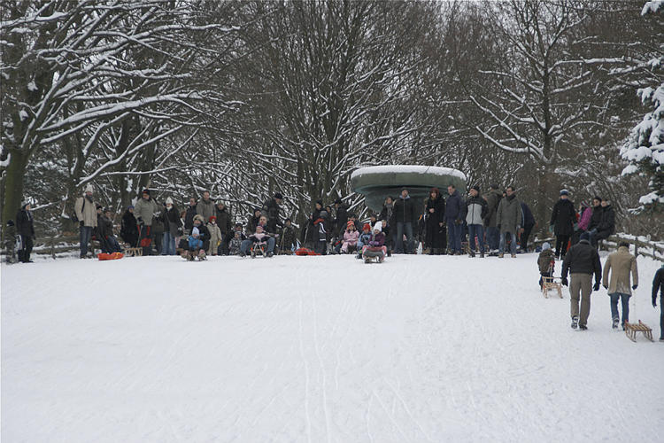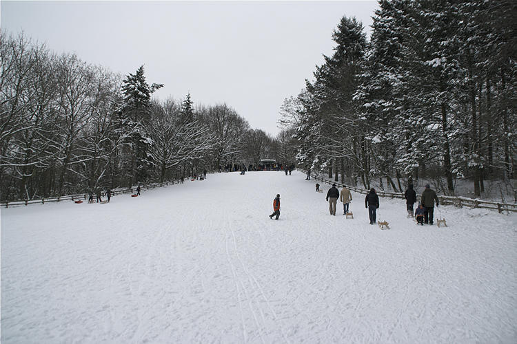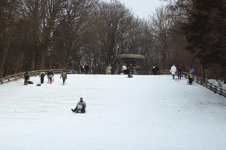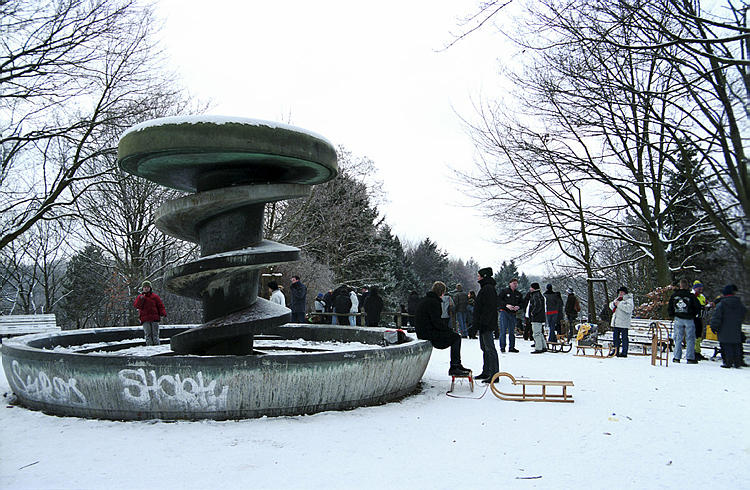 5. 3. 2005. Berlin. Mitte. Wedding. Park Rehberge. Winter. Schnee. Rodelbahn. Schlittenfahren. Rathenaubrunnen.