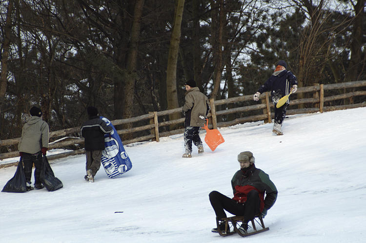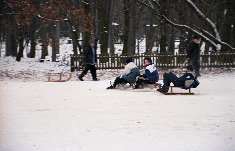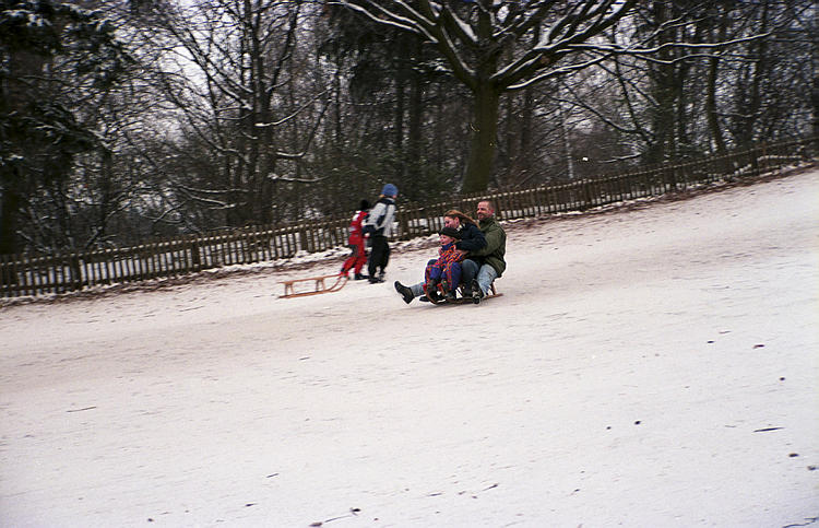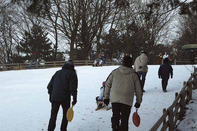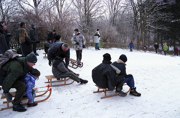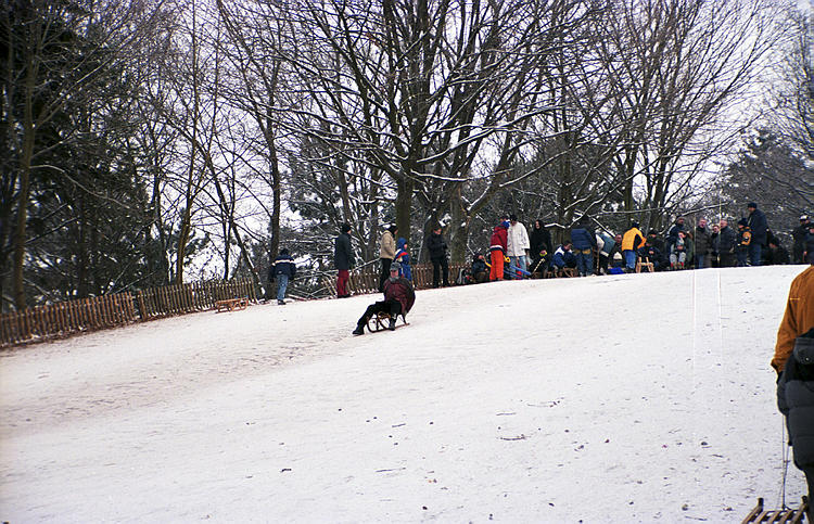 Januar 2003. Berlin. Wedding. Park Rehberge. Winter. Die Berliner nutzen das Wetter zum Schlittenfahren.