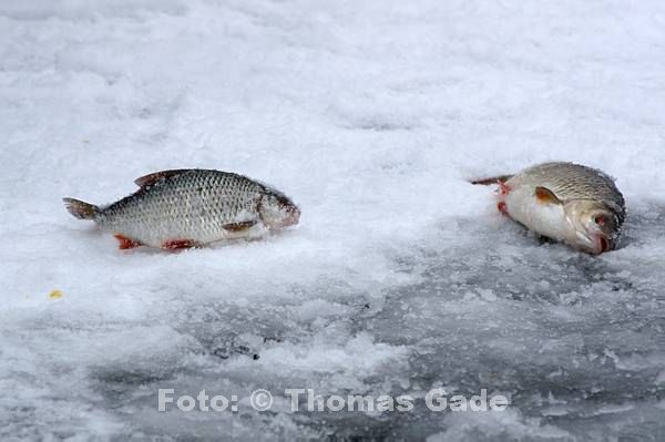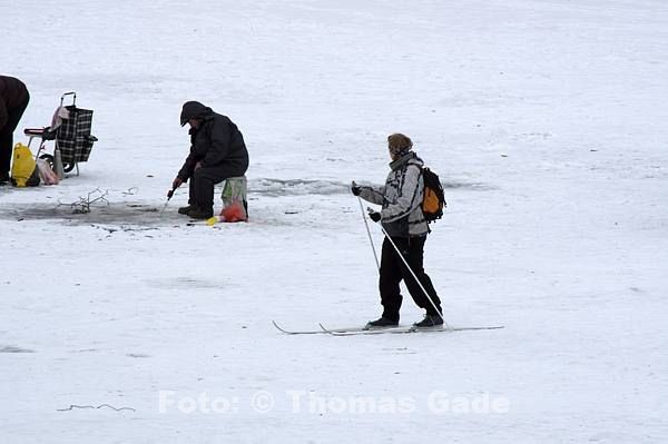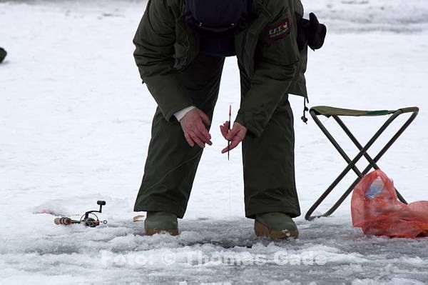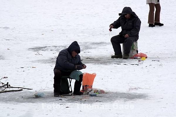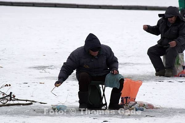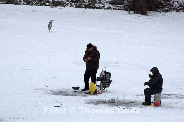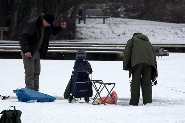 14. 2. 2012. Berlin. Zehlendorf. Wannsee. Zugefrorener Kleiner Wannsee. Winter. Eis. Schnee. Eisangler. Fische