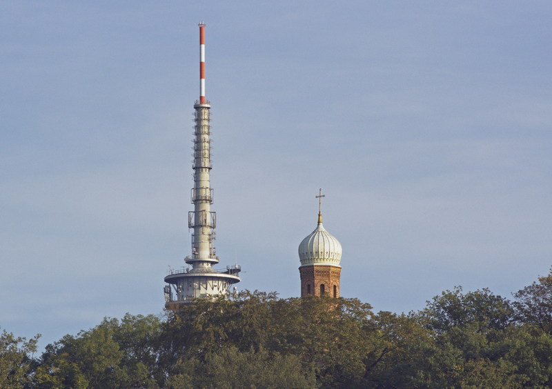 20. 9. 2011. Berlin. Zehlendorf. Wannsee. Fernmeldeturm Berlin-Schäferberg. Kirchturmspitze Evangelische Kirchengemeinde Zehlendorf St. Peter und Paul