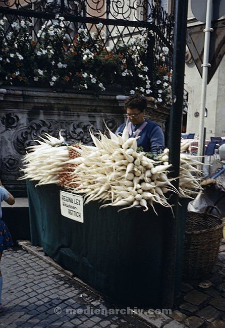 1980. Deutschland. Regensburg. Radi auf dem Gemüsemarkt.