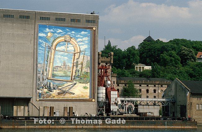 Mai 1995. Brandenburg. Dampferfahrt bei Potsdam. Sehenswürdigkeiten vom Wasser gesehen. Bemalte Fassade. Gemälde.