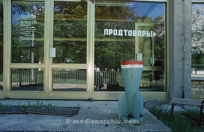 Mai 1994. Brandenburg. Gentzrode. Ehemaliger Militärstützpunkt der Sowjetischen Truppen in der DDR. Laden. Raketenrückteil als Papierkorb