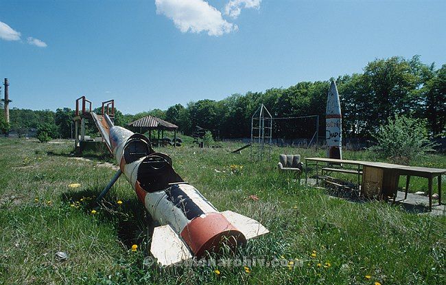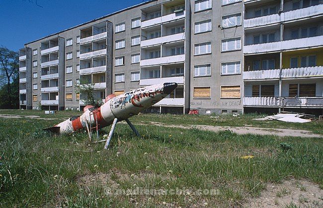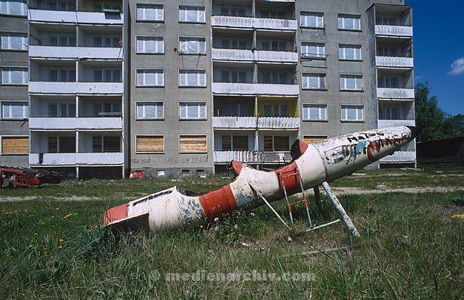 Mai 1994. Brandenburg. Gentzrode. Ehemaliger Militärstützpunkt der Sowjetischen Truppen in der DDR. Spielplatz vor dem Wohnhaus. Raketenattrappe als Spielzeug.
