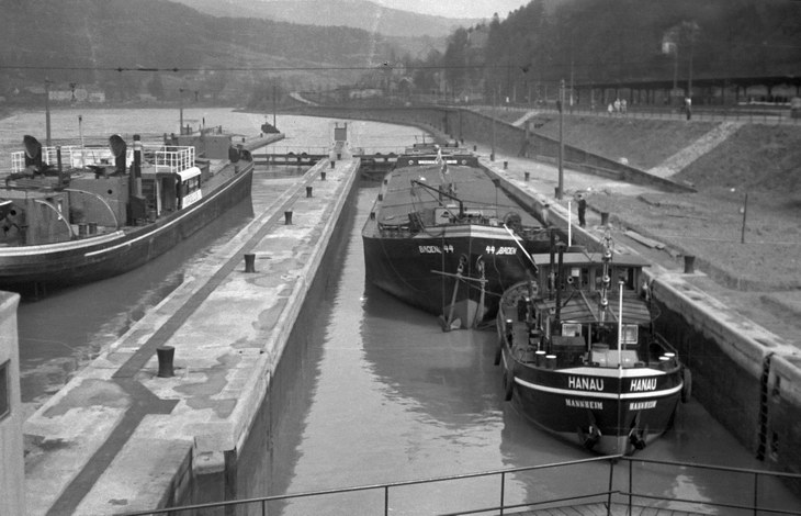 1950. Deutschland. Baden-Württemberg. Heidelberg. Fluss Neckar. Binnenschiffe in einer Schleuse